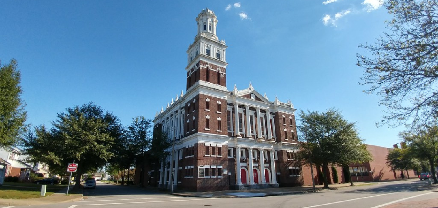 The building features decorative terra cotta and a stained-glass dome, and a two-tier, entrance portico with fluted columns.